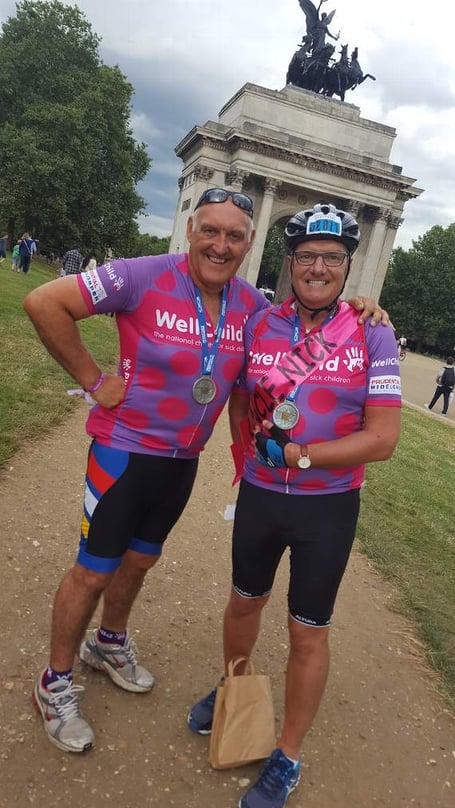The pair rode a gruelling 100 miles through the closed streets of the capital and Surrey and finishing outside Buckingham Palace, while raising money for the amazing charity Well Child.