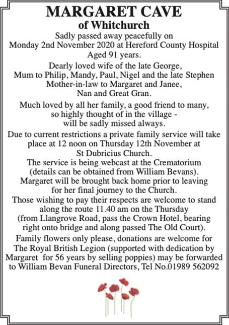 The funeral service for Margaret Cave of Whitchurch, a popular and well known supporter of the Royal British Legion, is taking place tomorrow at St Dubricius Church at noon.